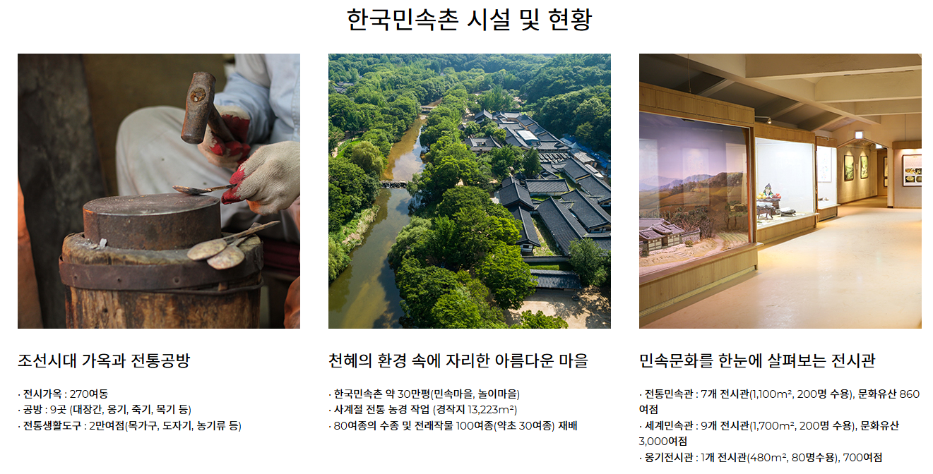 야외 체험 공간으로 유명한 한국 민속촌에도 실내에서 관람할 수 있는 다양한 전시관이 있습니다. 조선시대의 생활상을 재현한 모형과 함께 시대별 의상 및 생활 도구를 감상할 수 있습니다. 실내 전시관이라 날씨에 구애받지 않고 즐길 수 있는 점이 장점입니다.