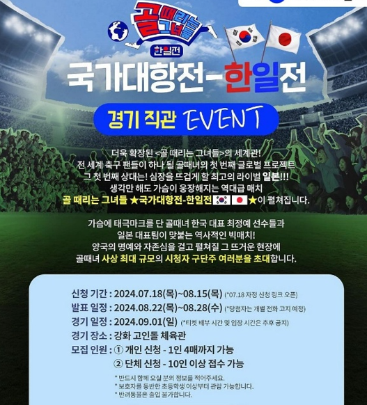 절대 놓쳐서도 절대 져서도 안 되는 자존심이 걸린 골때녀 (한일전) 한일 대항전이 펼쳐집니다 직관방법을 알려드리오니, 늦기 전에 반드시 신청하시기 바랍니다.