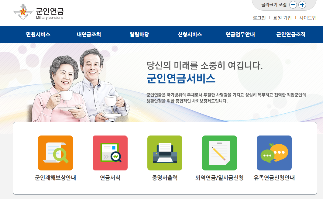 - 주요 기능: 연금 내역 조회, 민원 신청, 공지사항 확인, 증명서 발급 등