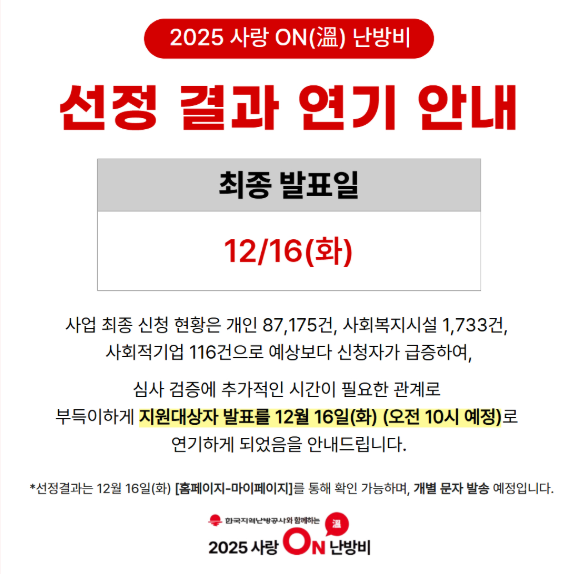 난방비는 겨울철 생활에 있어 단순한 비용이 아니라 생존과 직결된 문제입니다. 사랑온난방비 지원사업이 정말로 도움이 필요한 분들에게 전달되어 이번 겨울이 조금이라도 덜 춥기를 바랍니다.📌 결과발표일 놓치지 마시고📌 지급 전까지 마이페이지 꼭 확인하세요.