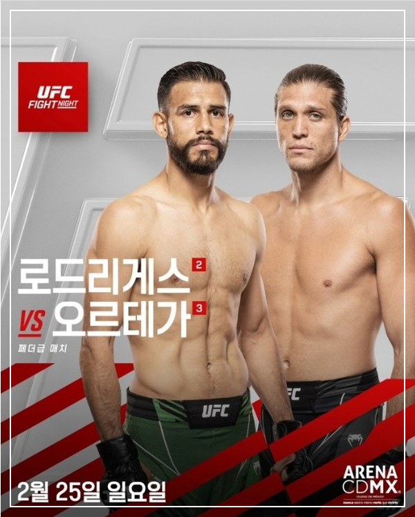 페더급 랭킹 2위에 위치하고 있는 로드리게스 페더급 랭킹 4위에 위치하고 있는 오르테가 이들은 1차전에서 한번 격돌한 적 있습니다. 이때는 로드리게스가 오르테가를 잡으며 승리했습니다. 22년 UBS 아레나에서 열린 UFC 파이트 나이트 메인이벤트에서 오르테가를 1라운드 4분 11초 어깨 부상에 의한 TKO 승을 거뒀습니다. 오르테가는 상위 포지션에서 테이크다운을 시도하다가 암바에 걸리 로드리게스의 다리를 뜯어 내려는 과정에서 어깨가 탈골됐고 어쩔 수 없는 사오 항에 의해 경기를 마무리 지을 수밖에 없었습니다.