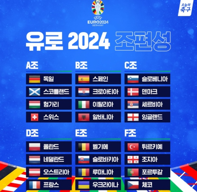 ※ 유로 2024 조별리그는 24팀이 각 조에 4팀씩 총 6개 조로 나누어 진행이 됩니다.