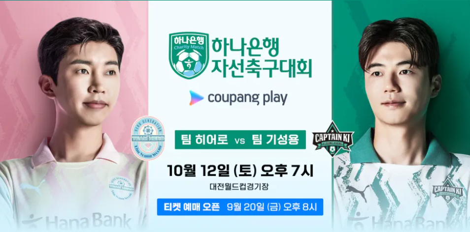 축구를 사랑하는 대한민국 대표 미스터트롯 임영웅 그리고 대한민국 자타공인 축구선수 기성용이 맞붙습니다. 10월 가을축구의 희로애락을 보여줄 자선축구대회로서 최고의 라인업이 포진하며 쿠팡플레이에서 단독으로 중계시청이 이루어집니다. 언제 또 이 화려한 라인업을 볼 수 있겠습니까? 절대 중계사수하시며 놓치지 마시기 바랍니다.