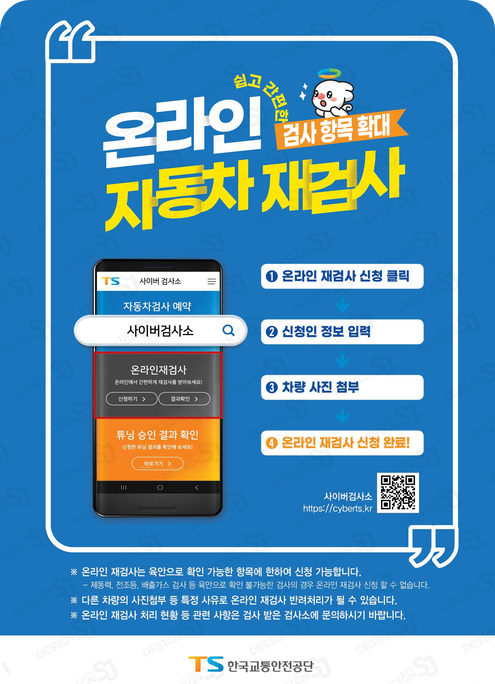 자동차 온라인 재검사란? 자동차 검사기기 측정 없이도 단순한 육안 확인으로 재검사가 가능한 부적합 사항에 대해 온라인으로 수리 부위 및 등록번호판이 포함된 사진을 등록한 후 재검사 신청을 할 수 있는 제도입니다. TS(한국교통안전공단)가 세계 최초로 2023년 11월부터 운영 중입니다. 올해 2025년에도 신청 접수를 진행합니다. 온라인 재검사를 원하시는 분들께서는 아래 TS 한국교통안전공단 공식홈페이를 통해 자세한 내용을 확인하실 수 있습니다.