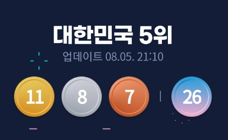 ※ 대한민국 현재(금메달 순위 5위이며, 전체합메달순위 6위이며, 금메달 11 / 은메달 8 / 동메달 7 / 총합계 26입니다