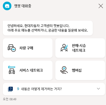현대자동차는 고객의 편의를 위해 AI 기반의 챗봇 서비스를 제공하고 있습니다. 이 서비스는 차량에 대한 정보 제공부터 구매 상담, 서비스 예약까지 다양한 기능을 지원합니다.