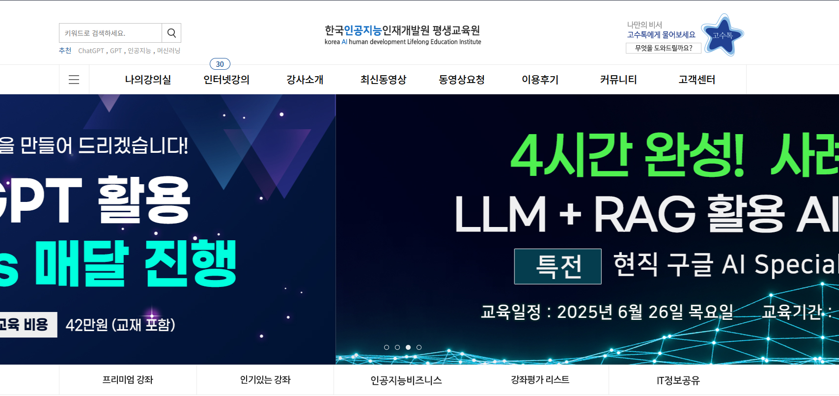 한국인공지능인재개발원 평생교육원은 기초부터 고급까지 다양한 난이도의 AI 교육과정을 제공합니다.