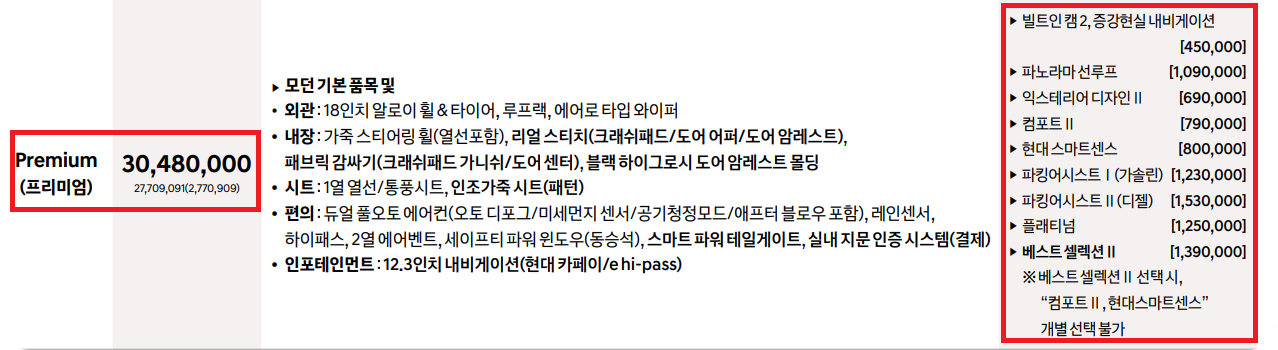 기본가격은 2,771만 원이며, 연비는 14.3km 배기량은 1,998cc입니다.