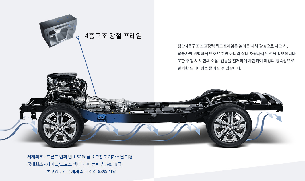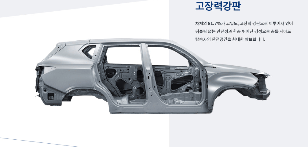 쉽게 말해, 뼈대에 튼튼함은 강조해도 입 아플 정도로 고밀도 고장력의 강판으로 이루어졌고