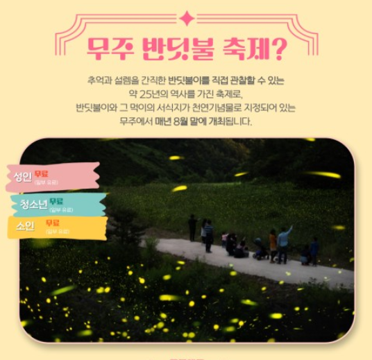 | 신청 접수 | 인터넷 선착순 접수 (무주반딧불축제 홈페이지) |