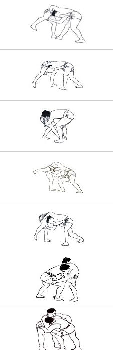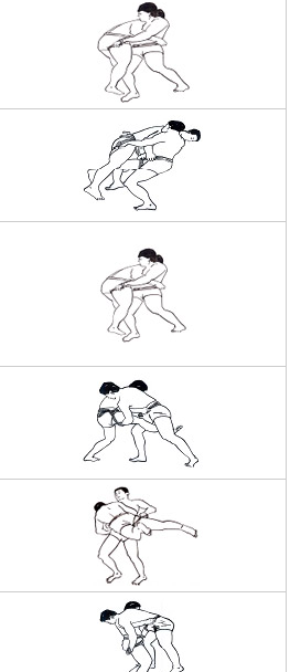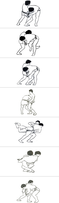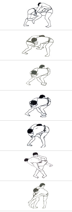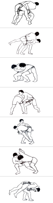 | 밀어치기 | 기본자세에서 상대의 좌측뒤편으로 밀어치기 하는 기술 이때 다리샅바와 허리샅바를 계속해서 잡아 당겨야 하는 기술 |