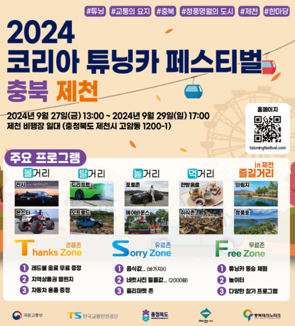 일상에서는 쉽게 경험하기 힘든 부분을 체험할 수 있는 좋은 기회입니다. 체험 행사 프로그램 : 드리프트 체험, 짐카나 체험 오프로드 체험들은 지금까지 이뤄진 제1회 제2회 코리아 튜닝 페스티벌에서 반응이 좋았다고 합니다. 드리프트 체험은 아찔한 코너링과 숨 막히는 질주 속에 박진감을 경험할 수 있으며, 짐카나 체험 또한 스피드에 향연 속에 무한히 빠져볼 수 있답니다. 그리고 오프로드 체험은 울퉁불퉁한 산악지형과도 같은 지대를 스릴 있게 체험할 수 있어서 또 하나의 재미라 할 수 있습니다 또한 행사장에서 즐기다 보면 배고플 시 행사장 내 먹거리도 있습니다. 또한 제천에는 맛집도 유명한 곳이 참으로 많습니다. 하단에 링크를 통해 제천 맛집도 경험해 보시기 바랍니다 또한 이번에 열리는 2024 코리아 튜닝카 페스티벌에 보다 자세한 사항이 알고 싶으시다면 공식홈페이지 주소를 남길터이니 부담 없이 알아보시기 바랍니다