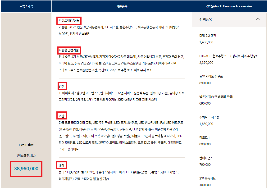 ※ 간략히 익스클루시브에 대한 가격만 포스팅하며, 전체적인 가격세부사항은