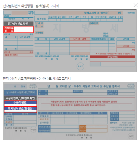 빨간색 네모칸에 납부 고지서에 적혀 있는 전자납부번호를 적습니다. (밑에 사진을 참고하세요.)
