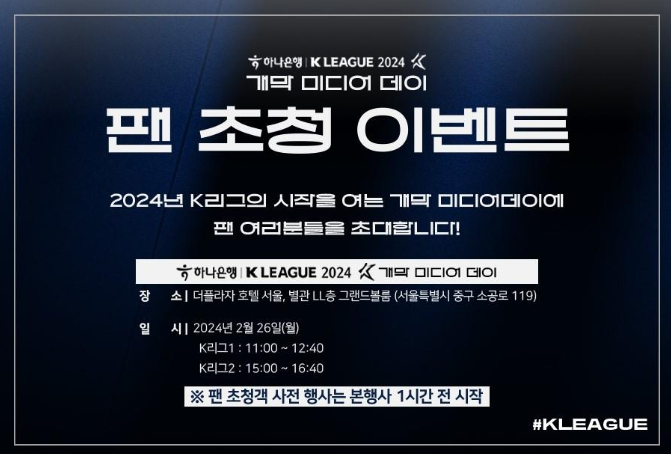 26일 서울 중구 더 플라자 호텔에서 하나은행 K리그 2024 시즌 개막을 앞두고 미디어 데이 행사를 개최했습니다. 올해 3월 1일 울산 HD축구단과 포항스틸러스의 개막전경기 시작으로 약 9개월이라는 대장정의 막을 올렸습니다.
