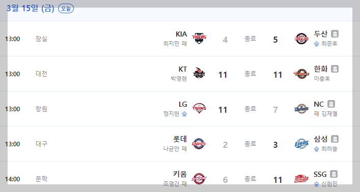 안녕하세요. 한국 프로야구 3월 15일의 시범경기 구단별 내용 및 결과를 포스팅해드리려 합니다.
