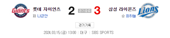 삼성이 홈으로 롯데를 불러 3대 2 스코어로 승리했습니다. 시범경기지만 열띤 경기력을 양팀다 보여주었습니다. 아쉽게도 득점포가 많이 터지지 않아 아쉽지만 그럼에도 삼성 팬들은 승리의 기쁨이 마음껏 누렸습니다. 삼성은 선발투수 이승현이 2이닝 5피 안타 2 자책 2 실점 4 탈삼진을 기록하였고 이어 계투로 나선 장칠준 양현 이재익 김태훈이 무실점 호투를 펼치는 장면을 보였습니다. 롯데에 0대 2로 끌려가던 상황에서 삼성 김영웅의 3점포 홈런으로 짜릿한 역전승을 거뒀습니다.
