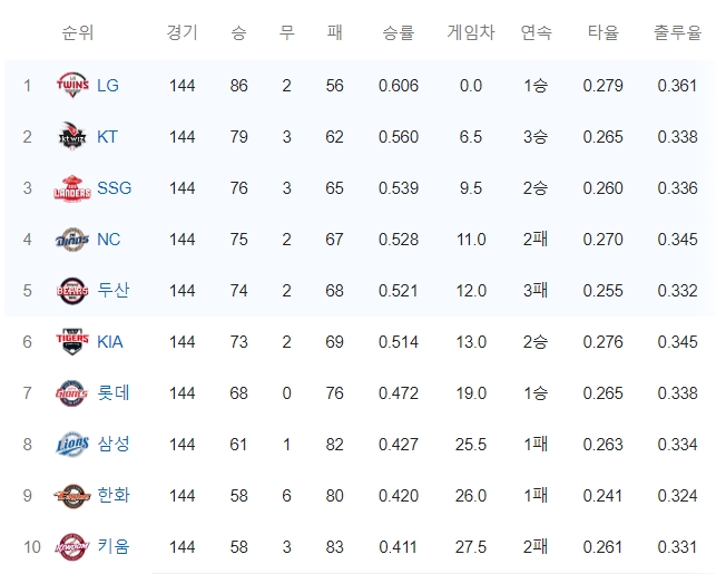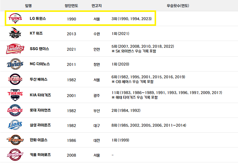 창단일은 1990년 3월 15일로 연고지는 서울이며 구단주는 구광모이며, 82년 한국프로야구와 함께 출범한 MBC 청룡을 인수합니다. 창단 후 바로 3월 27일 서울 구장에서 열린 경기에서 삼성 라이온즈를 만나 승리했습니다. 83년에는 한국 시리즈에 진출했으나 해태 타이거즈를 만나 4패와 1승을 거두고 준우승에 머무르게 됩니다. 이후에는 중하위권에 자리하며 포스트시즌에 진출하지 못했습니다. 우승이라는 간절함은 스쳐 지나가는 순간들이 많았고 물론 우승의 경험도 있지만 준우승에 머물러야 하는 뼈아픈 순간들도 많이 맞이한 LG 트윈스 그러나 그 고통과 아픔을 많은 시간과 세월이 보상하여 주듯 우승을 경험하게 됩니다. 바로 2023년 29년 만에 정규시즌 우승 그리고 한국시리즈 통합 우승을 하면서 한국프로야구에 또 하나의 기록되었습니다.