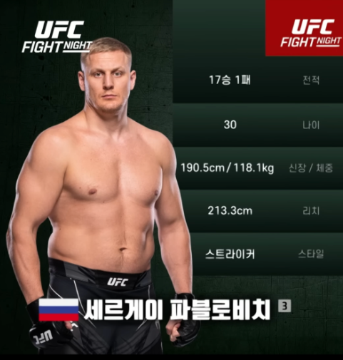 숨 막히는 경기가 찾아옵니다. UFC 파이트 나이트에서 준비했습니다. 6월 23일에 펼쳐지는 파격적인 흥분되는 경기 바로 세르게이 파블로 비치와 알렉산더 볼코프의 화끈한 경기가 예정되어 있습니다. 먼저 파블로 비치를 보면 본명은 세르게이 블라디미로비치 파블로비치이며 출생은 1992년 생 5월 13일의 생일을 간직하며 올해 나이 32입니다. 러시아 로스토프주에서 태어났습니다. 국적은 역시 러시아이며 신체조건은 191 키에 118 몸무게 팔 리치는 213센티를 기록합니다. 종합 MMA 전적으로는 20전 18승 2패의 수려한 준수한 경기력을 자랑합니다. UFC 랭킹 헤비급 3위를 기록 중이며 FNG 초대 헤비급 챔피언을 지냈으며 FNG 헤비급 타이틀 방어 1차까지 성공한 바 있습니다. 이에 맞서는 알렉산더 볼코프 선수를 만나보겠습니다. 파블로 비치와 같은 국적인 러시아 국적이며 1988년생 10월 24일생입니다. 올해 나이 35입니다. 종합 MMA 전적은 47전 37승 10패 대단한 경험과 기록을 간직하며 보유한 최고의 헤비급 스타입니다. 현 UFC 랭킹 5위에 안착하고 있습니다. 과거 타이틀 또한 대단합니다. 벨라토르 헤비급 토너먼트 대회에서 여러 차례 우승을 휩쓸었으며 챔피언의 커리어를 가지고 있습니다. 6월 23일 랭킹 3위 파블로 비치 그리고 랭킹 5위에 빛나는 볼코프 과연 어떠한 경기결과를 보여줄지 기대가 상당합니다. 두 선수의 경기운영 능력 또한 기대가 됩니다. 많은 시청 부탁드립니다.