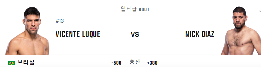 웰터급의 강자들 또한 소개합니다. 먼저 브라질 국적의 빈센트 루케 선수입니다. 잘생긴 외모와 더불어 신체조건 그리고 옥타곤 안에서 상대와의 재미난 경기운영 능력까지 갖춘 타고난 싸움꾼이라 할 수 있습니다. 이에 맞서는 그 유명한 네이트 디아즈 선수의 형이자 카리스마와 실력을 겸비한 닉 디아즈 선수입니다. 루케선수는 앞으로 곧 펼쳐질 UFC 304에 출전하는 벨랄 무하마드 선수와의 과거 격돌한 전적을 가진 유명한 선수입니다. 타이론 우들리 선수를 만나 승리했으며 수많은 선수와의 대결에서 물론 패를 기록 중이지만 승도 꽤 괜찮은 수준임은 분명합니다. 과연 니아즈를 상대하고 빈센트 루케를 상대하는 웰터급 매치에서의 이 둘의 결과는 누구의 승리로 돌아갈까요? 8월 4일 생중계 놓치지 마세요.