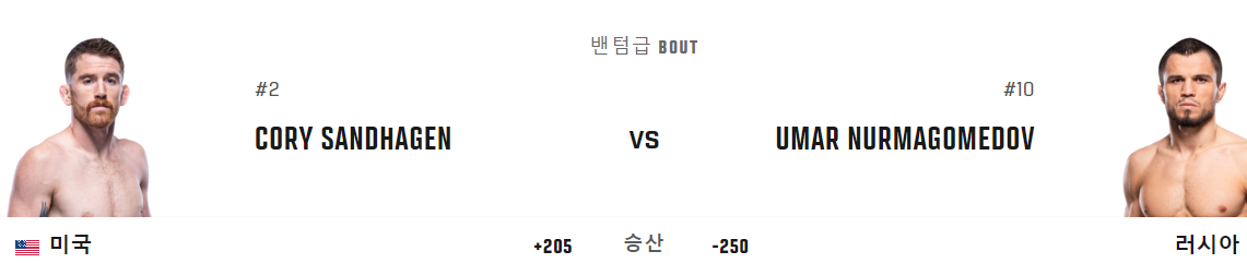 먼저 메인카드 내용부터 살펴보겠습니다. 본명 코리 제임스 샌드헤이건 92년생 4월 20일(32살) 미국 국적이며 종합격투기 전적으로는 21전 17승 4패를 기록 중입니다. 7Ko가 눈길을 끕니다. 신체조건은 180 키와 61 몸무게 178의 리치를 가지고 있습니다. 현 UFC 밴텀급 2위를 기록 중입니다. 또한 SCL 초대 페더급 챔피언을 지낸 바 있습니다. 이에 맞붙는 본명 우마르 마고메드나비예비치 누르마고메도프 96년 생 3월 1일에 태어났으며 28살 그리고 다게스탄 공화국 눈을 떴으며 국적 역시 러시아입니다. 그의 종합격투기 전적으로는 17전 17승 무패 대단한 기록을 가지고 있습니다. 물론 한방에 KO 승 보다 판정까지 이르는 승이 더 많지만 결코 만만치 않은 상대임은 분명합니다. 현재 UFC 밴텀급 10위 랭커 중입니다. 양선수의 장점은 먼저 코리 샌드하겐은 밴텀급 치고 긴 다리와 긴팔을 가지고 있으며 수준급 높은 그래플링 실력을 갖추고 있는 선수입니다. 그리고 우마르 누르마고메도프 선수는 유명스포츠 삼보와 레슬링을 기본 베이스로 추구하는 선수이며 하빕(사촌형)의 지도와 도움을 많이 받아 기본 파이터로서의 자질을 지닌 선수입니다. 지금까지 메인카드 소개였습니다.